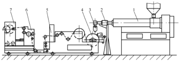 1—擠出機;2—過濾器;3—模具;4—冷卻輥;5—表面處理機;6—切邊機;7—卷取機
